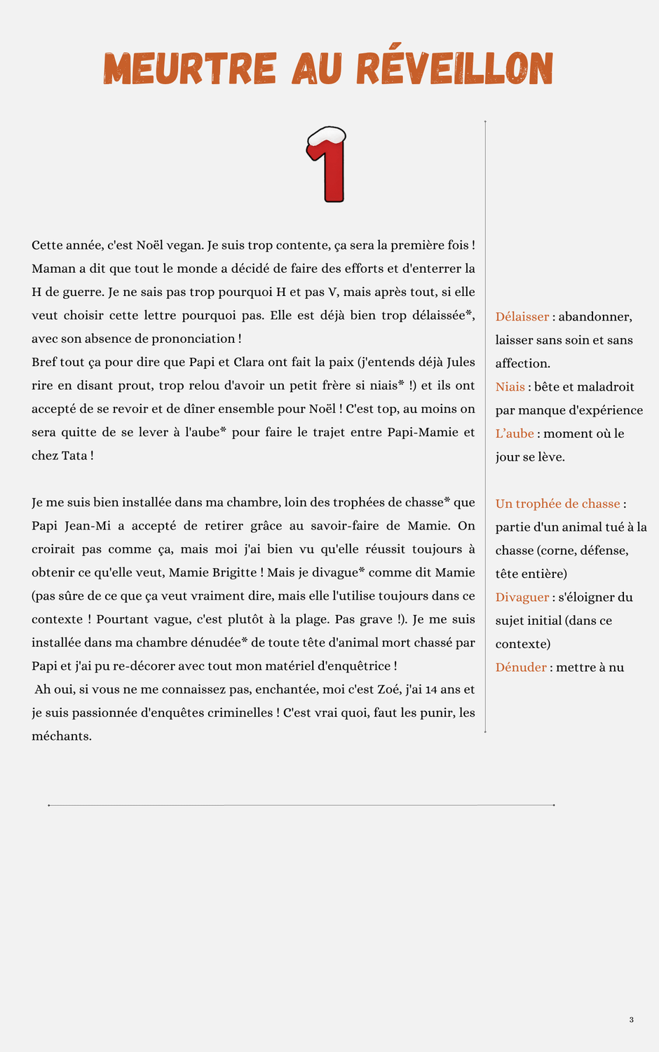 Mystère au réveillon est une nouvelle type "polar" (un genre que j'adore) à cause de l'histoire qu'elle raconte. Notre personnage principale est une jeune détective de 14 ans, Zoé, qui doit résoudre un meurtre qui a lieu au réveillon. Elle cherche des indices, trouve des traces, questionne tous les invités à la fête. Elle vérifie les alibis, elle trouve le mobile et, à la fin, elle trouve les coupables. D'un côté, il s'agit d'une histoire drôle, passionnante et amusante à lire à toute la famille pour Noël. Mais d'un autre côté, c'est un exemple de comment la langue française n'arrêtera jamais de m'étonner, de m'apprendre quelque chose de nouveau.